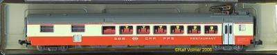 Model Details Model: Minitrix 3148 Status: Era: Epoch IV Classification: Description: SWISS Express Dining Car Comments: Livery: SBB Grey / Orange Model Length: 15.4 cm Model Weight: Weight: Max. Speed: Number: 1 IDs: 146