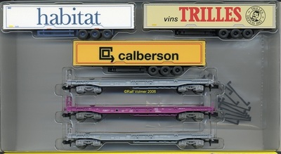Model Details Model: Minitrix 15146 Status: Era: Description: Piggyback Flat Car Set - French Livery: Comments: Model Length: Model Weight: Weight: Max. Speed: Number: 1 IDs: 182